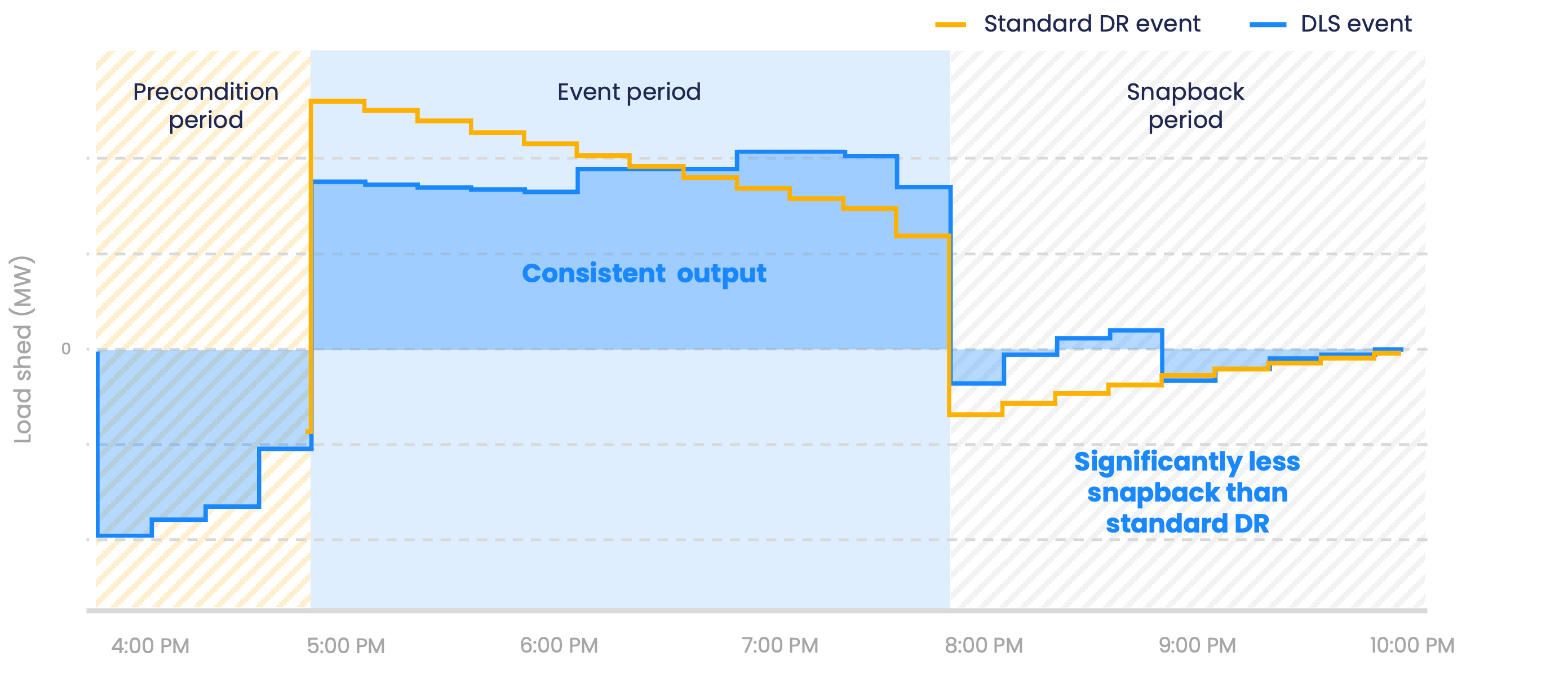 - Minimize transmission‑level impacts — By smoothing the increase in load typically caused by preconditioning and snapback before and after an event, DLS prevents unintended system peaks and protects critical infrastructure